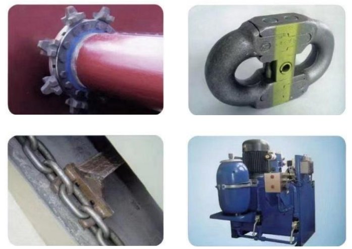 4、链条的张紧装置根据设备长度和工艺要求分为:蜗轮蜗杆增力张紧和全液压自动张紧两种形式。前者调节省 力、操作方便,但需定期张紧;后者无需经常张紧,减小了链条的磨损,是一种理想的结构。